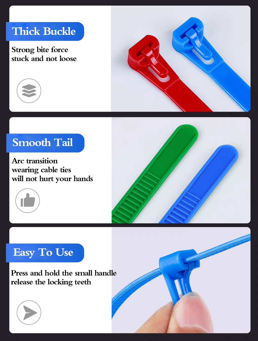 【Conception de boucle autobloquante】 Chaque serre-câble dispose d'un mécanisme autobloquant durable qui se verrouille de manière très sûre et ne bougera pas avec le temps, et les dents de verrouillage arrêtent le serre-câble à la longueur souhaitée. Facile à utiliser et va droit au but. La boucle lâche résout le problème d'usage unique des serre-câbles ordinaires, et la boucle lâche permet de réutiliser le serre-câble.