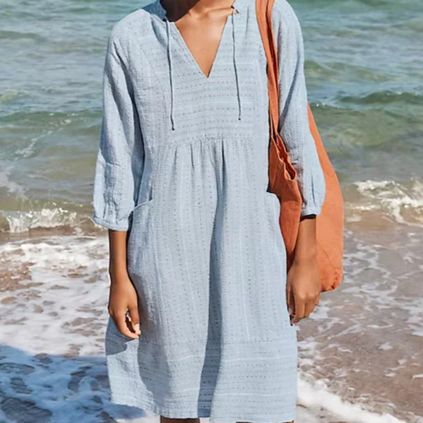 👗Sommarklänning i bomull och linne med V-ringning för kvinnor💕