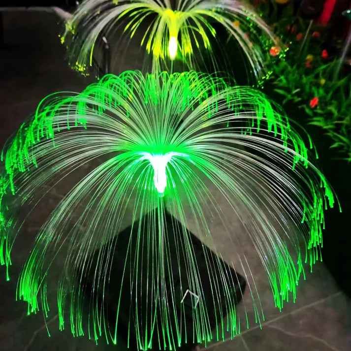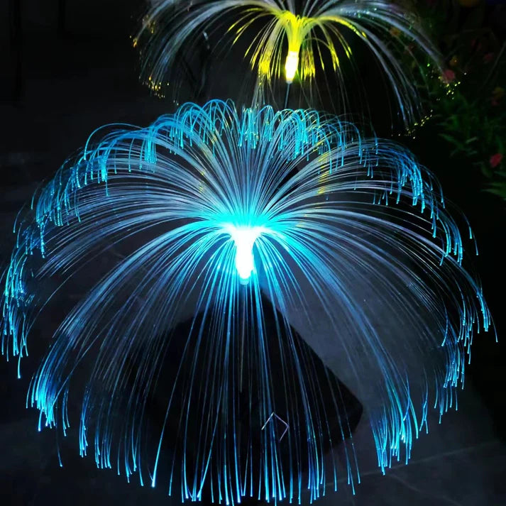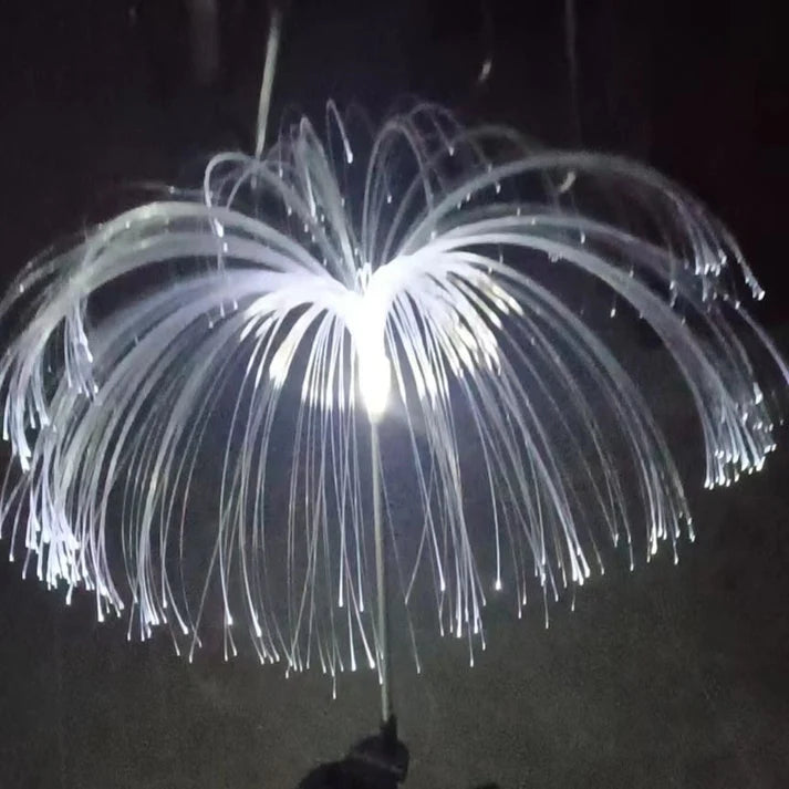 Cette lampe solaire de jardin possède des corps ressemblant à des méduses, la lumière est émise par la fibre optique sur chaque corps, et la fibre optique souple est aussi belle qu’une méduse nageant.