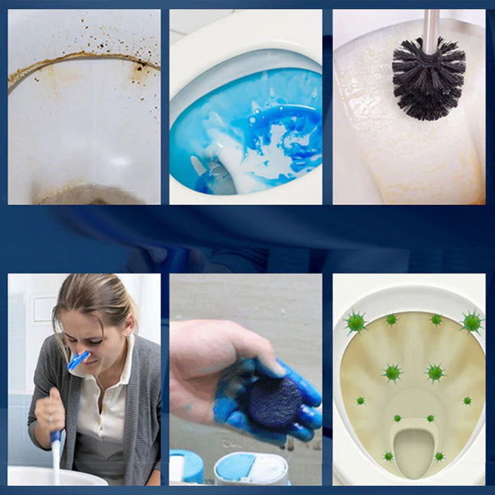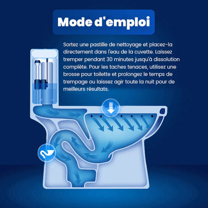 COMPRIMÉS DE NETTOYAGE DES TOILETTES - Peuvent être utilisés pour éliminer la saleté tenace sous la ligne d'eau ainsi que les taches d'urine, le calcaire, les taches de rouille et les vieilles taches dans la cuvette des toilettes pour une propreté en profondeur.