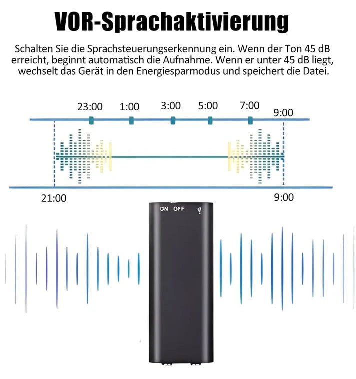 🔊Avant l'activation vocale : Enregistrement automatique lorsque le niveau sonore atteint 45 dB. La fonction VOR permet d'économiser la batterie en passant en mode d'économie d'énergie lorsque le niveau sonore diminue.