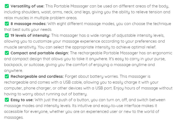 Découvrez le Masseur Portable rechargeable ultime pour soulager vos douleurs musculaires et vous détendre au maximum ! Avec ses incroyables 8 modes de massage spécifiquement conçus pour répondre à vos besoins, et ses 19 niveaux d'intensité réglables, cet appareil est votre allié parfait pour le bien-être personnel.